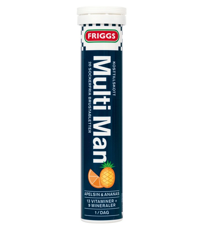 Brustabletterna löses snabbt upp i ett glas vatten och smakar gott av apelsin och ananas. Perfekt för dig som har svårt att svälja tabletter eller kapslar. Vitaminerna av naturligt ursprung och organiskt bundna mineraler. Innehåller sötningsmedel. Friggs Multiman brustabletter.